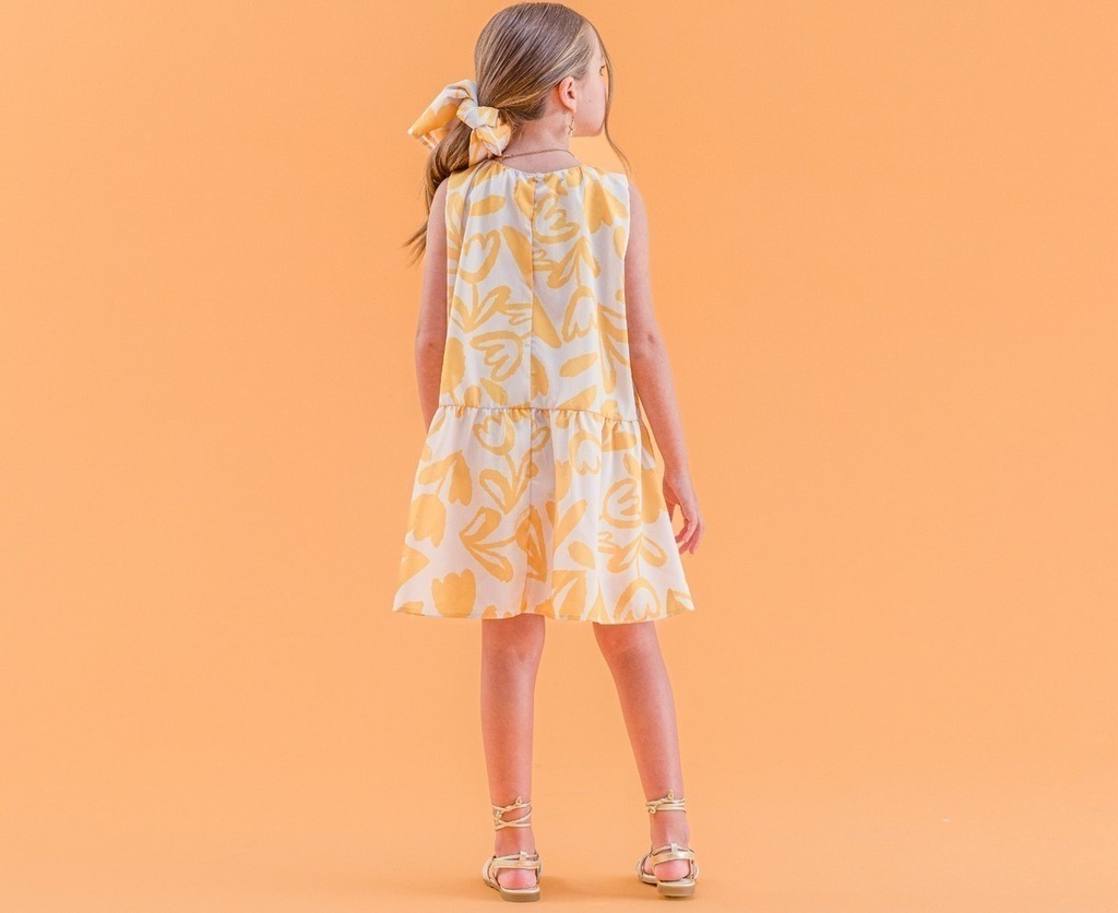 Com estampa floral em tons de amarelo e off-white, ele traz um ar leve e divertido, perfeito para passeios, aniversários e momentos especiais em família.